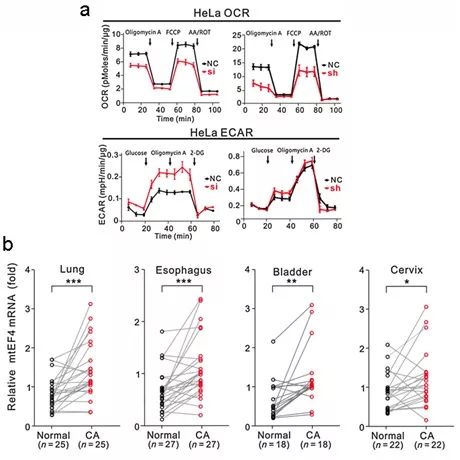 图示:a.mtEF4与细胞能量代谢关系;b.癌变组织mtEF4表达升高。