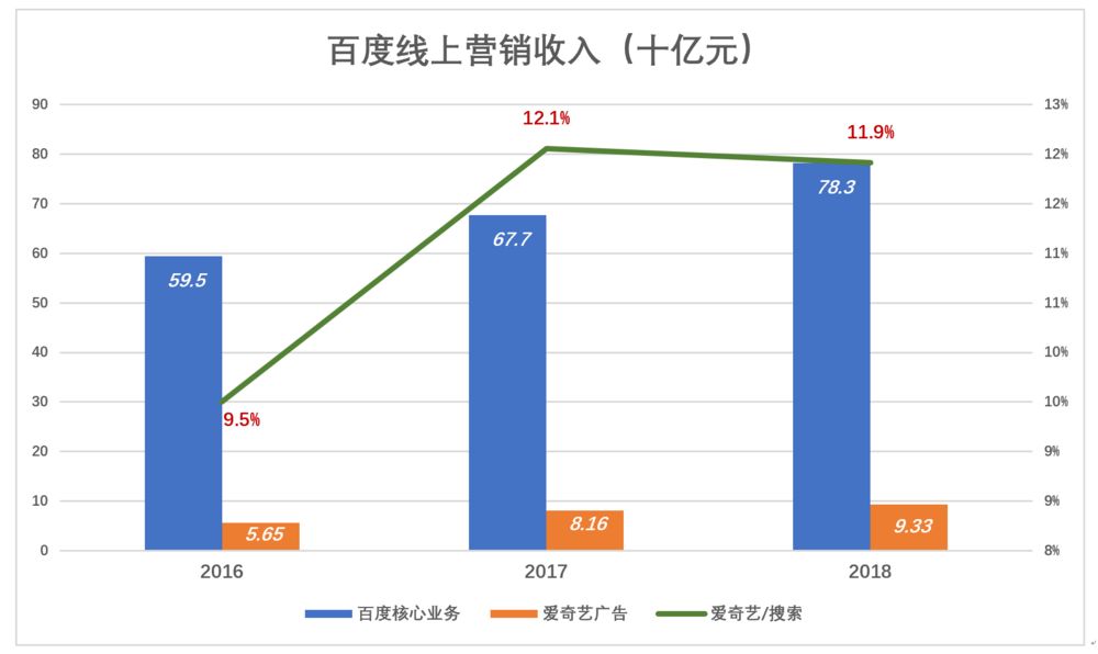 2018年,百度核心业务(Baidu Core)即大搜营收783亿、爱奇艺广告收入99.3亿。2017年、2018年爱奇艺广告收入与大搜收入的比例分别为12.1%和11.9%,几乎没有变化。