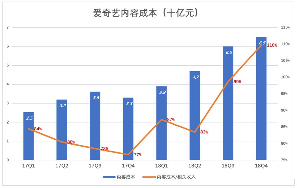 以内容成本为分子,把广告、会员服务、内容分发等收入加起来做分母,得到的数值大有“一飞冲天”之势。2018年Q2,内容成本是相关收入的83%,到了Q4这个数值变成110%。