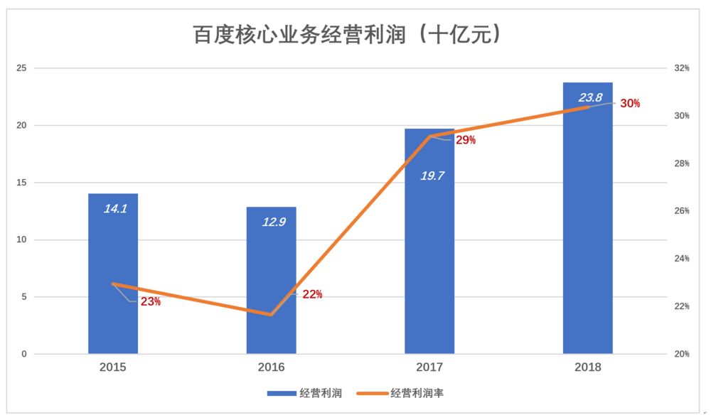 2018年百度毛利润529亿,费用合计291亿。经营利润238亿(较2017年增长20.5%),经营利润率为30%。