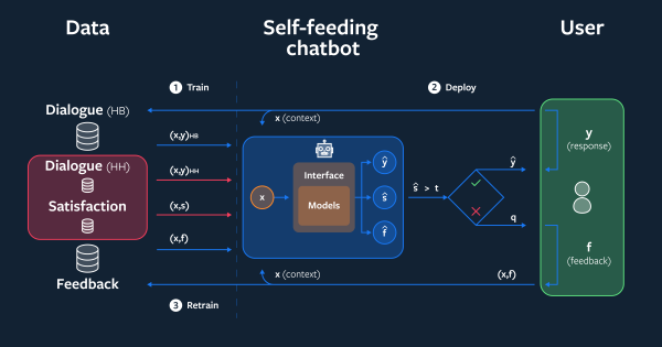 self-feeding会话机器人回复人类用户后,会评估每一次人类用户的满意程度。当用户不满意时,self-feeding会话机器人会收集用户反馈,并构建一个模型用于预测用户的满意度。self-feeding会话机器人会根据满意度,给出一个还不错的回复。使用了该方法后,回复的准确率提升了31%.