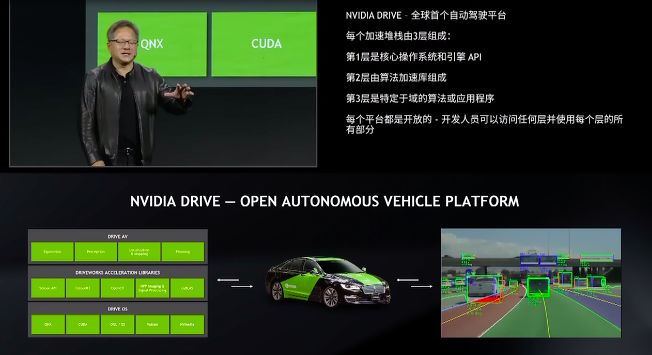 在自动驾驶方面,黄仁勋又介绍了一遍全球首个自动驾驶平台——NVDIA DRIVE 的详细情况。它的每个加速堆栈由 3 层组成,第一层是核心操作系统和引擎 API,第二层是算法加速器,第三层是特定于域的算法或应用程序。重要的是,每个平台都是开放的,开发人员可以访问并使用任何层。