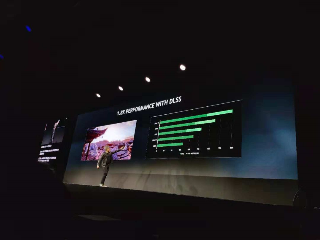 黄仁勋补充说,通过 DLSS 可以实现 1.8 倍的性能,从下图可以看到清晰的对比,浅绿色的部分是使用了 DLSS 之后,GPU 提升的性能: