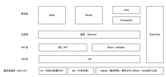 在开发这个项目前,我去参加了北京的首届 vueconf 大会,其中有一个主题是阴明讲的《掘金 Vue.js 2.0 后端渲染及重构实践》,讲了掘金重构后的架构设计,我觉得他们的架构设计的挺不错,所以参考掘金的架构,设计了一个更适合我们自己业务场景的架构