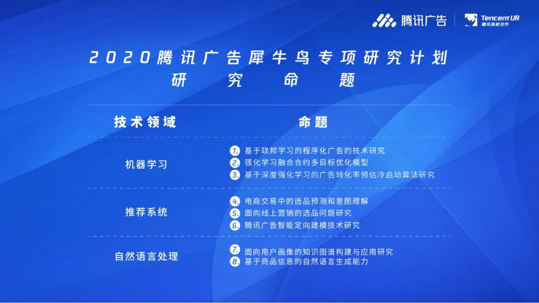 2020腾讯广告犀牛鸟专项研究计划围绕机器学习、推荐系统、自然语言处理三大技术领域话题设立八大研究命题,顺应隐私保护、知识图谱等行业趋势,期望通过与学界多种形式的交流合作,推动前沿技术在腾讯广告的落地应用。