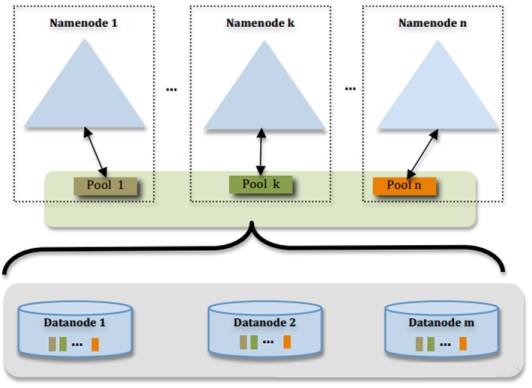 每个NN都会定义一个存储池,有单独的id,每个DN都为所有存储池提供存储。