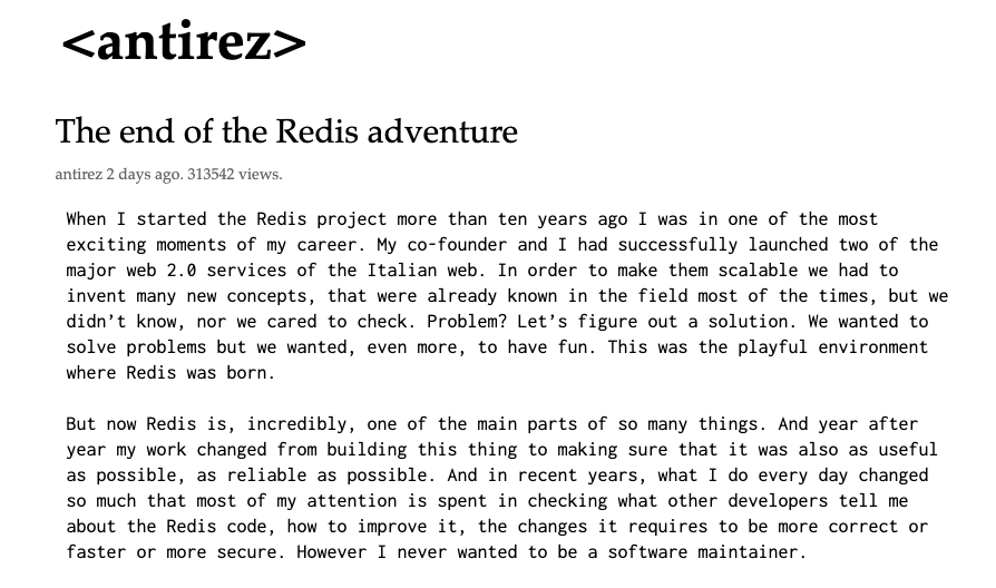 “最近几年来,我每天的工作内容发生了很大变化。我把大部分精力花在检查其他开发者提交的 Redis 代码、改进代码质量以及提升软件正确性、速度与安全性方面。但我真的不喜欢这类维护工作。”他还提到,根据自己的编码习惯,他“更愿意当个有脾气的艺术家,而不是那种有求必应的程序员。”