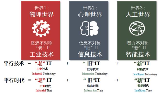 在我们采取行动之前,需要知道自己身在何处。当然,我们身处世界之中,但又是哪个世界?根据当代最伟大的一位科学哲学家Karl Popper(1902-1994)的观点,我们拥有三个世界(见图1):世界1,主要由“老”IT驱动发展的物理世界(客观世界);世界2,主要由“旧”IT支撑进步的心理世界(主观世界);以及世界3,完全由新IT构建而成的人工世界。三个世界交织构成我们的现实,我们同步且平行地存在于其中。因此,在三个世界的物理、心理和人工层面上,真正高效和智能的ITS必须是可规划、可设计、可构建、可运行和可使用的。我非常高兴看到,许多研究工作,包括我们自己在平行驾驶和平行交通系统方面工作[2][3],特别是MIT和其他科研机构的近期成果[4][5],已经沿着这一方向对ITS展开了相关研究。