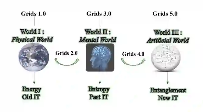 对于即将到来的第三轴心时代,我们需要打开思路重新考虑其中的交通问题。如图3所示,物理交通网络只是网络1.0阶段的社会基础设施,除此之外,电力网络是网络2.0阶段的社会基础设施,信息网络对应网络3.0,物联网(IoT)对应网络4.0,而即将到来智联网(Society of Mind)则对应网络5.0阶段的社会基础设施。在Popper的三个世界概念中,ITS将网络1.0至网络5.0合成为一个网络,这个网络将三个世界重新连接组合为一个世界,以创造更加美好的生活(见图4)。正如最近的新兴技术例如社会交通(从Uber到摩拜单车)、社会能源(从智能电网到能源互联网)、社会计算、社会制造和社会智能的出现,将引导智能经济系统和共享服务的逐步形成和完善,并最终实现智能社会。我们必须发展实现ITS的新IT,并通过ITS构建智能社会和人类的智慧生活。
