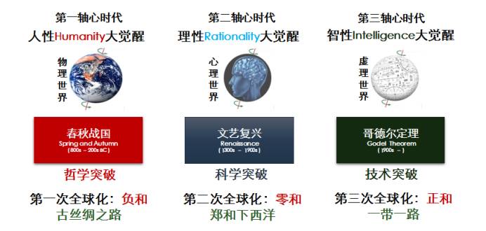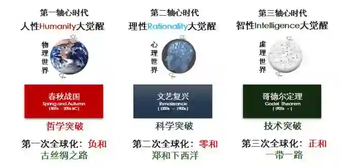 根据Karl Jaspers(1883-1969)的观点,我们仍处在他的轴心时代。在他的著作《历史的起源与目标》中,Jaspers创造了“轴心时代”这一术语,用以描述约在公元前800年到公元前200年间,中东、印度、中国和古希腊罗马那些唤醒人性且极具影响力的伟大哲学家们所处的这一时期。然而,我相信一个“枢纽时代”意义下的新轴心时代已经开始。基于Karl Popper关于现实的三个世界模型,我们认为每个世界都有其对应的轴心时代的这一看法是合乎情理的,即,Jaspers的第一轴心时代对应于客观世界;20世纪的文艺复兴则代表了一个唤醒理性且富有影响力的伟大科学家诞生的时期,对应于心理世界的轴心时代。而现在,AI和新IT标志着一个伟大的智能觉醒及其研究与发展取得重大技术跨越的新时代的开始,即以开发人工世界为使命的第三轴心时代。