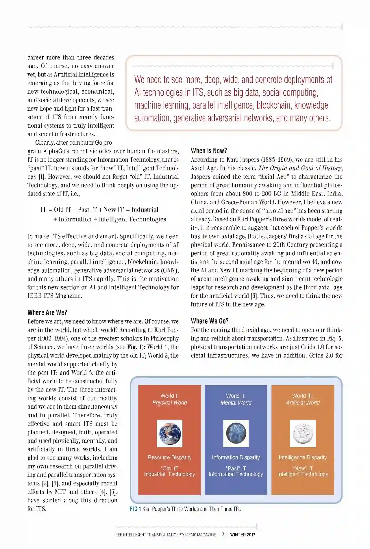 以使ITS更加高效且智能。具体而言,我们需要快速地了解ITS中更多、深入、广泛和具体的AI技术部署情况,例如大数据、社会计算、机器学习、平行智能、区块链、知识自动化、生成式对抗网络(GAN)以及许多其他技术等。这是IEEE ITS杂志新增这一AI与智能交通系统栏目的内部动机。