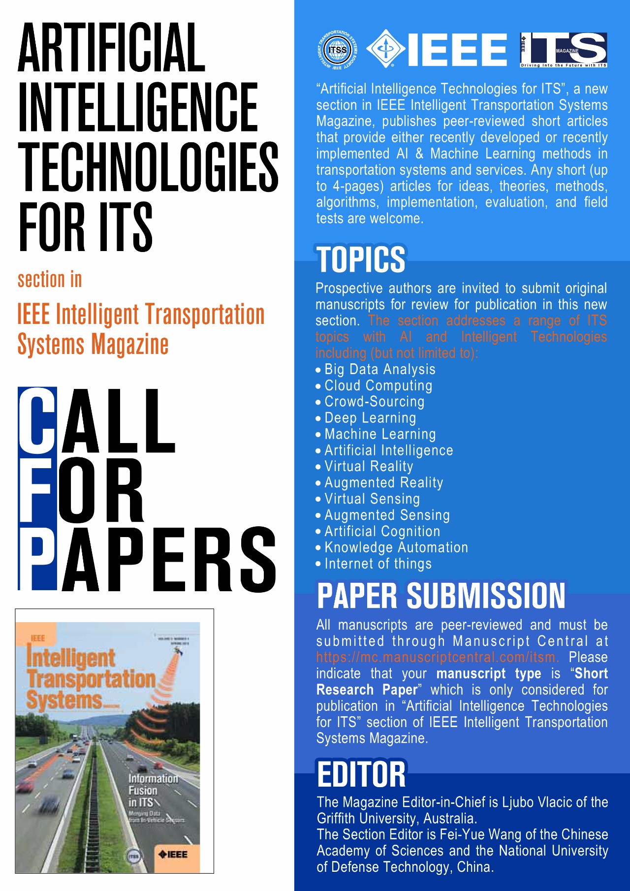 “Artificial Intelligence Technologies for ITS”, a new section in IEEE Intelligent Transportation Systems Magazine, publishes peer-reviewed short articles that provide either recently developed or recently implemented AI & Machine Learning methods in transportation systems and services. Any short (up to 4-pages) articles for ideas, theories, methods, algorithms, implementation, evaluation, and field tests are welcome.