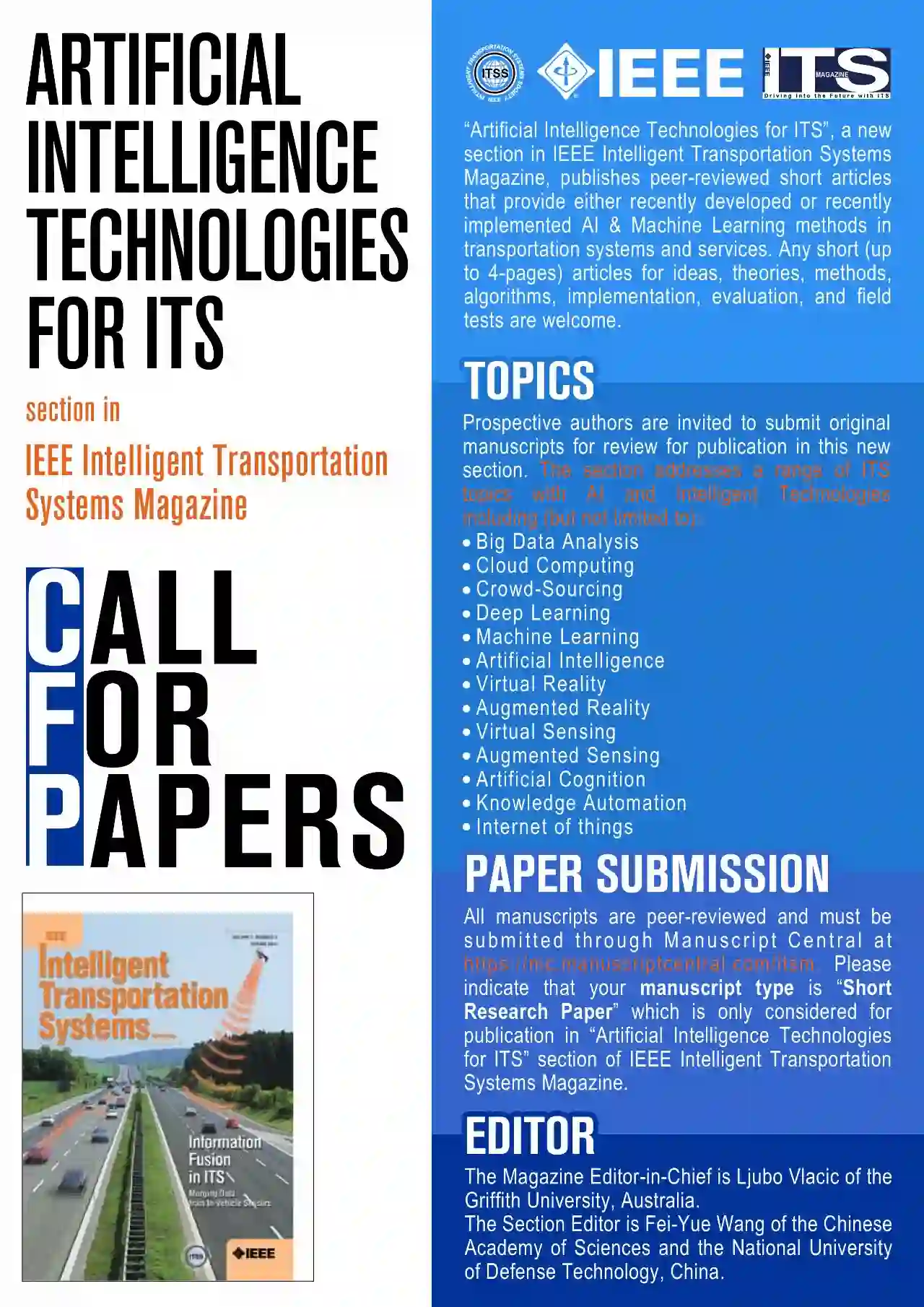 【文末附征稿通知】Call for Papers: “Artificial Intelligence Technologies for ITS” Section in IEEE Intelligent Transportation Systems Magazine