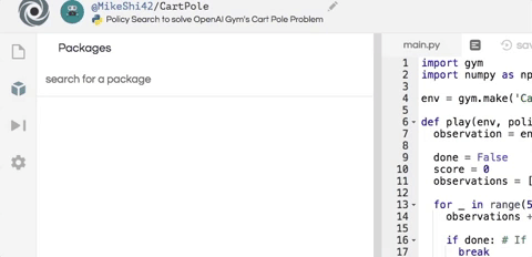 安装这个项目所需的两个软件包:numpy 用于帮助数值计算,而 OpenAI Gym 则作为智能体的模拟器。如下图所示,只需在编辑器左侧的包搜索工具中输入 gym 和 numpy,然后单击加号按钮即可安装这两个包。