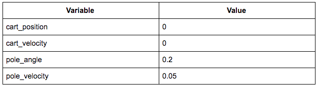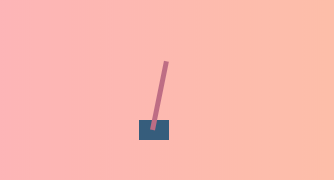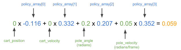 此时的状态向量为 [0, 0, 0.2, 0.05]。直观地说,现在我们想要将推车推向右侧,并将杆拉直。这里通过训练中得到了一个很好的策略,即 [-0.116, 0.332, 0.207, 0.352]。将上面的状态向量与策略向量进行点积处理,如果得到的结果为正,则将推车向右推动;反之则向左推动。
