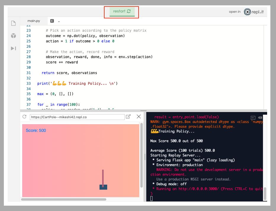 如果现在运行 repl,正常情况所得到的最大分数应为500。如果没有的话,请再次尝试运行 repl! 通过这种方式,能够完美地观察游戏策略是如何让杆达到平衡的!
