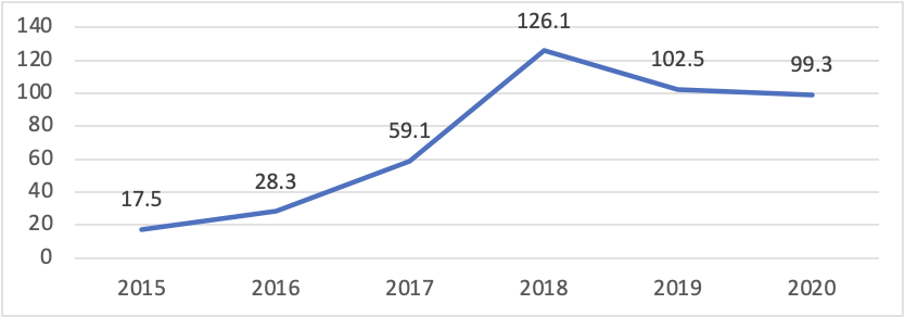 中国在2017年和2018年对初创企业的投资有了非常大的增长,并在2018年达到了最高的126亿美元。然而,在2019年和2020年期间则有所下降。