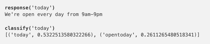 首先,我们对无上下文相关的“today”的回应是不同的。我们的分类产生了2个合适的意图,而“opentoday”被选中,因为“今天”的意图虽然较高的概率,而被限制在不再适用的上下文中。语境很有用!