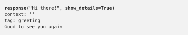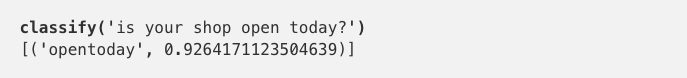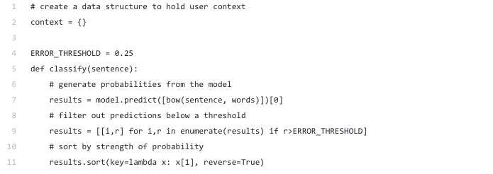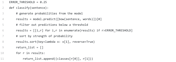 每个传递给response方法的句子都被分类。分类器使用model.predict()并且非常快。模型返回的概率向量与我们的意图按顺序一一对应,生成潜在响应列表。