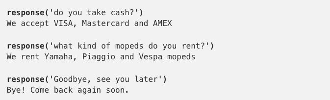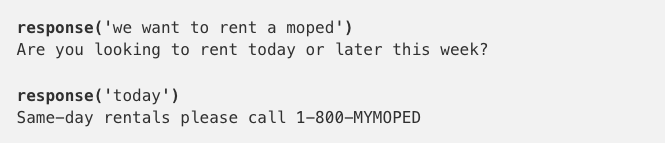 我们将创建一个聊天机器人框架,为一个小岛上的轻便摩托车租赁店建立一个对话模型。这家小店的聊天机器人需要处理营业时间,预订选项等简单问答。我们也希望它能处理客户根据上下文提出的问题,例如关于同一天租金的查询。体验能做好的话,可以让客户的假期留下美好回忆!