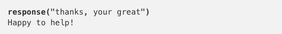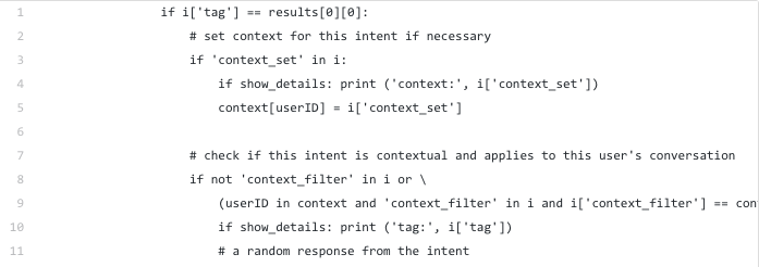 我们将构建一个简单的状态机来处理响应,使用我们(从上一步)的意图模型作为分类器。这就是聊天机器人的工作原理。