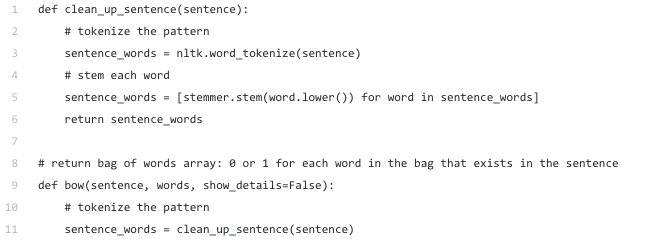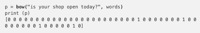 在处理意图之前,我们要想办法把用户输入生成词袋。这个技巧与我们以前使用过的训练文本相同。