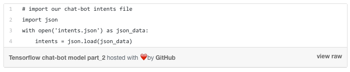 加载 JSON 会话意图文件(https://github.com/ugik/notebooks/blob/master/intents.json)后,现在可以开始设计我们的文件、词语和分类器的类。