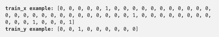 如果我们看一个单一的x和y列表元素,我们会得到词袋数组,一个用于意图模式,另一个用于意图类。