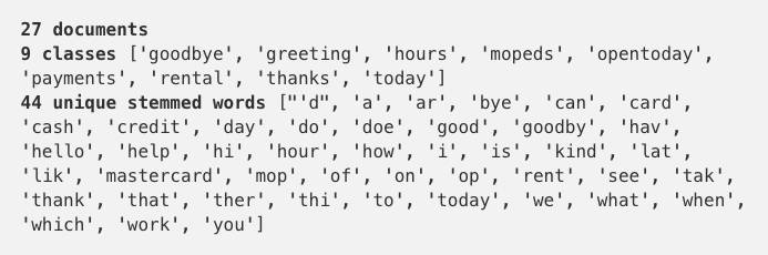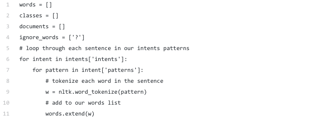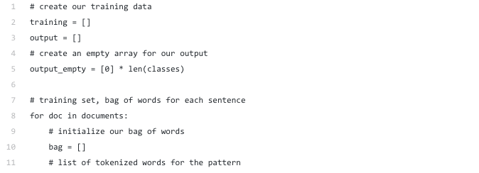 我们创建了文件(句子)列表,每个句子是一个由词干组成的列表,每个文件关联一个意图(一个类对象)。
