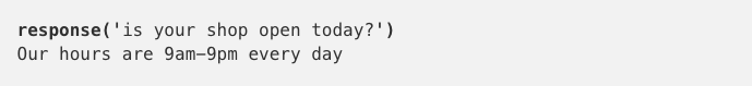 雷锋网提醒,“你的店今天营业吗?”不是这个意图的模式之一:“模式”: [“今天营业吗?”, “今天什么时候开业?”, “今天的营业时间?”] ;而不管对应项“营业”和“今天” 多么适合模型(它们在选择的意图中是突出的)。