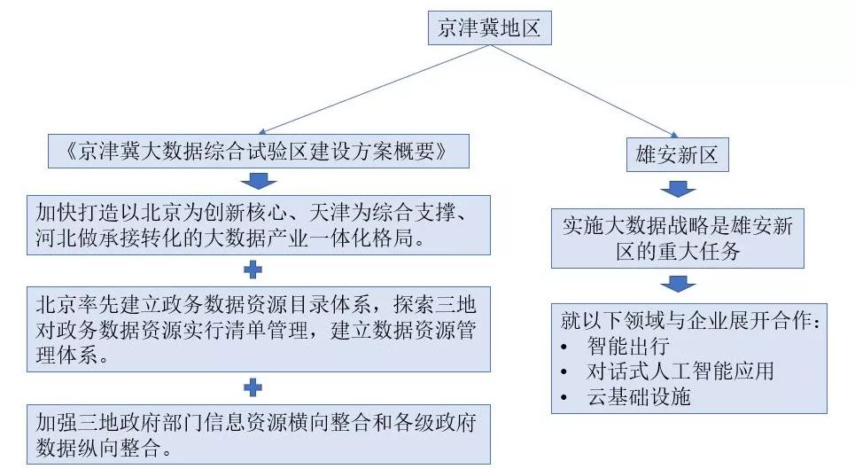 京津冀地区将依托北京,尤其是中关村在信息产业的领先优势,三地共同建设大数据综合试验区,以大数据的思维、技术、模式、产品、服务等突破行政藩篱和区域界线,将京津冀区域打造成为国家大数据产业创新中心、国家大数据应用先行区、国家大数据创新改革综合试验区、全球大数据产业创新高地。
