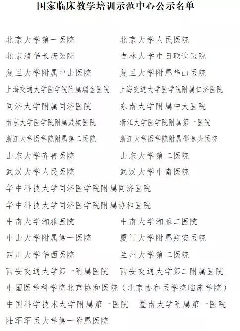 按照《国务院办公厅关于深化医教协同进一步推进医学教育改革与发展的意见》(国办发〔2017〕63号)、《教育部办公厅 国家卫生健康委办公厅关于开展国家临床教学培训示范中心建设工作的通知》(教高厅〔2018〕3号)精神与要求,经专家综合评定,认定74家高校附属医院(牵头医院)为首批国家临床教学培训示范中心,具体名单如下: