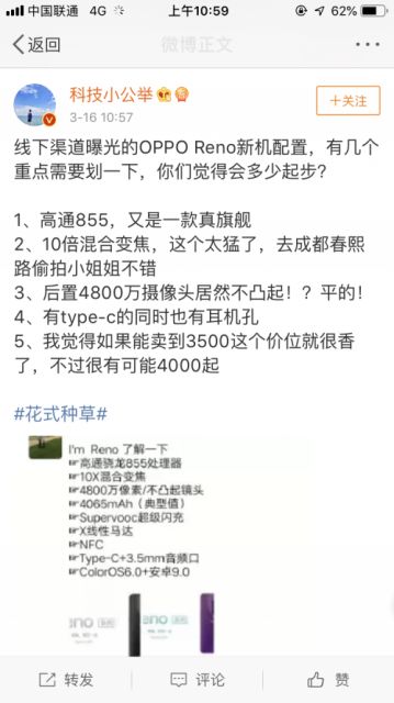 【TechWeb】今日,微博“科技小公举”疑似透露OPPO Reno详细配置信息。