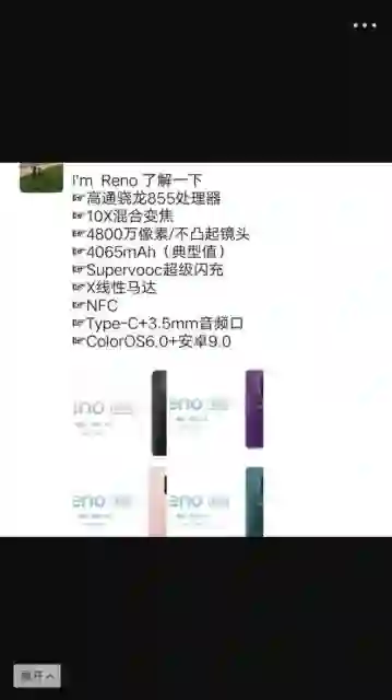 图片显示,OPPO Reno将搭载高通骁龙855移动平台,10倍混合光学变焦技术,搭载4800W像素摄像头(不凸起镜头)。
