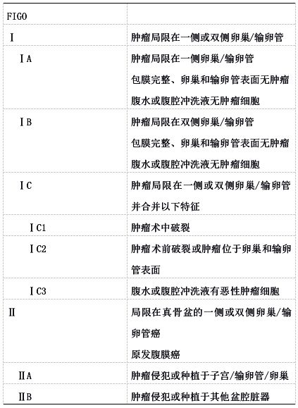 卵巢上皮癌、输卵管癌、腹膜癌及其他类型卵巢恶性肿瘤采用FIGO 2014年修订后的分期系统(表3)。