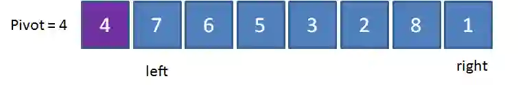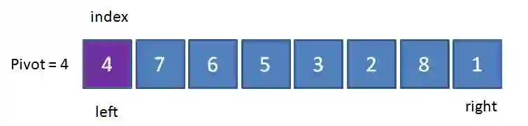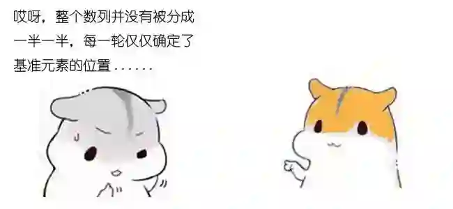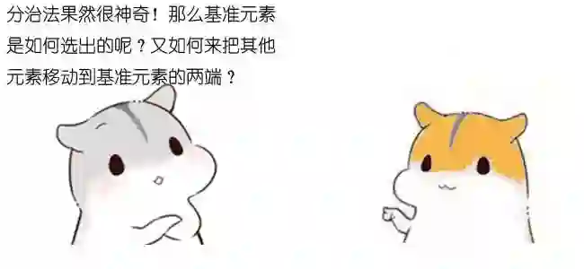 选定了基准元素以后,我们要做的就是把其他元素当中小于基准元素的都移动到基准元素一边,大于基准元素的都移动到基准元素另一边。