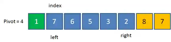 在当前数列中,7>4,所以把7填入index的位置。这时候元素7本来的位置成为了新的坑。同时,right向左移动一位。