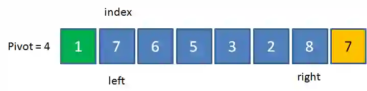 首先,我们选定基准元素Pivot,并记住这个位置index,这个位置相当于一个“坑”。并且设置两个指针left和right,指向数列的最左和最右两个元素: