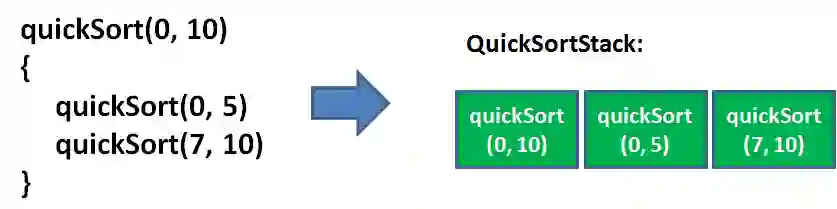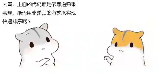 每一次循环,都会让栈顶元素出栈,进行排序,并且按照基准元素的位置分成左右两部分,左右两部分再分别入栈。当栈为空时,说明排序已经完毕,退出循环。