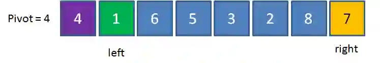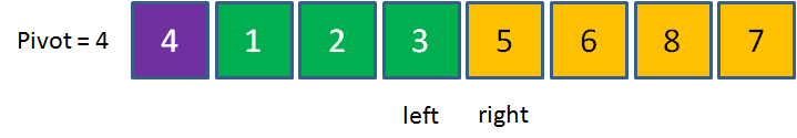 当left和right指针重合之时,我们让pivot元素和left与right重合点的元素进行交换。此时数列左边的元素都小于4,数列右边的元素都大于4,这一轮交换终告结束。