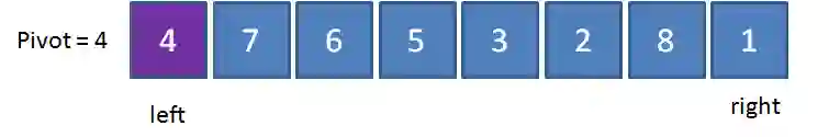 开局和挖坑法相似,我们首先选定基准元素Pivot,并且设置两个指针left和right,指向数列的最左和最右两个元素: