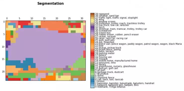 这些结果仅来自于将全连接层转换为原始形状,而保持了原本的空间特征。在上边所展示的实例中,我们输入一张 768*1024 的图像到 VGG 中,然后获得一层 24*32*1000,其中 24*32 是该图像池化后的版本,而 1000 则指的是 Image-net 的类别数量,从中可以导出分割结果。