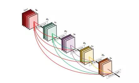 Densenet 模型草图,早期的滤波器堆叠在整个模型中