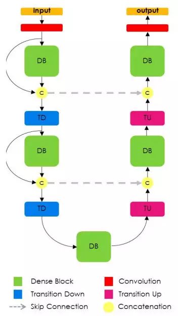 Tiramisu 模型是参考了 DensNet 的设计而提出的。而 DensNet 是一个最近提出的图像分类模型,在这个模型中所有层都相互连接。此外,Tiramisu 还在上采样层添加了跳跃连接(Skip connections),这一点和 Unet 一样。