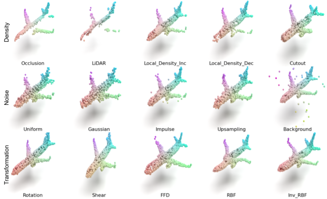 该研究提出了一个新颖并且全面的 3D 点云识别稳健性分析数据集 ModelNet40-C。研究者提出并构建了了 75 种不同的失真类型和程度来模拟真实场景中由于物理限制、传感器准确度限制、以及处理过程中造成的点云失真和损坏。ModelNet40-C 包含 185000 个不同的点云数据。