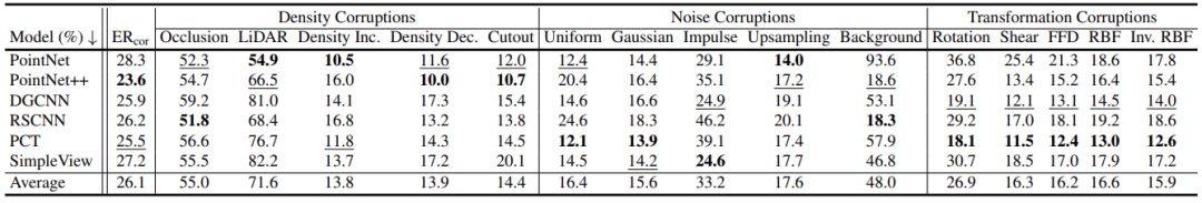 表 2. 在标准训练下不同模型在 ModelNet40-C 上的错误率。