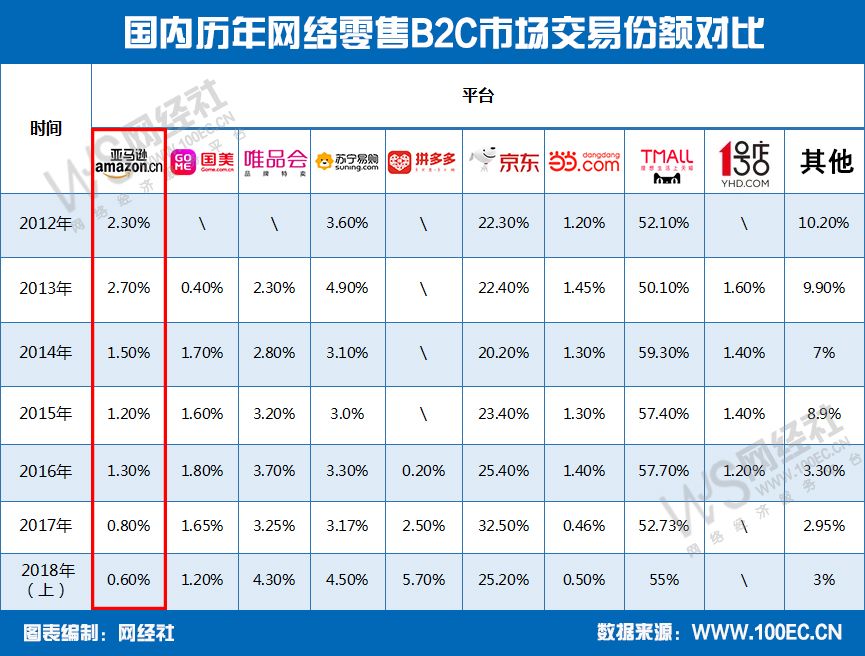曹磊看来,到目前为止,天猫、京东、拼多多、唯品会、苏宁易购、网易考拉和严选等几百家大小电商平台,已将中国电商B2C的“蛋糕”几近瓜分殆尽,市场格局基本成型,亚马逊很难在华“突出重围”。