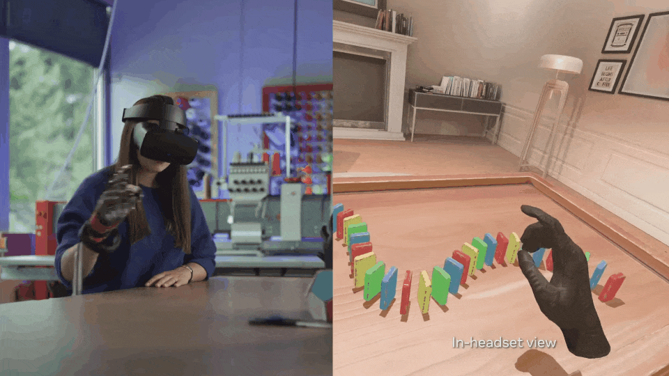 虽然触觉手套可以提供有价值的反馈,但它们不能完美地阻止你的手指在试图抓住一个虚拟物体时闭合,也不能阻止你的手在虚拟桌子上停留时穿过桌子。
