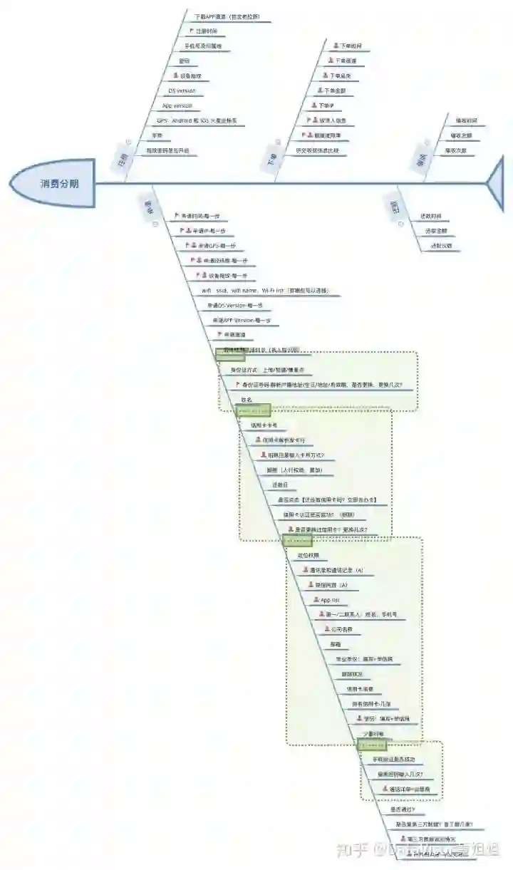 通过卧底,你能够对目前产品的欺诈情况有一个初步的了解。接下来,你需要系统梳理每一步的风险点,并做标记。为此,黄姐姐同样以某消费分期产品为例做一个梳理,红色小旗和小人为重要风险点: