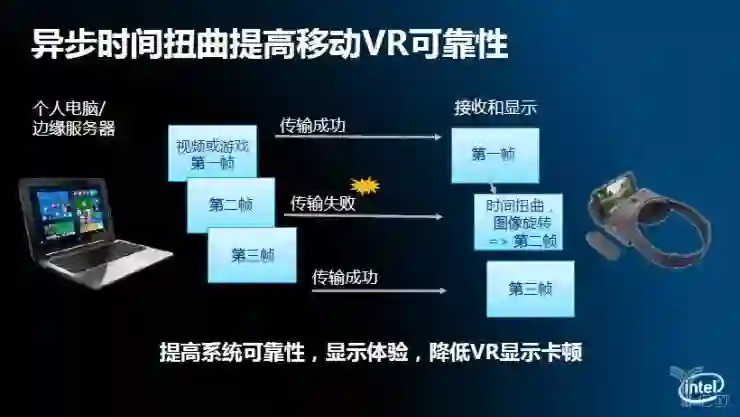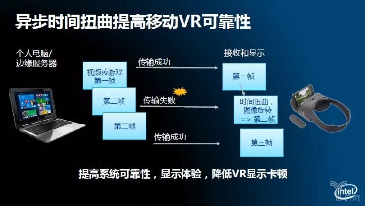 举个例子,通过边缘服务器或者是个人的笔记本,把视频、游戏传到头显端,第一帧会正确接收,当第二帧传输失败的时候,头显端会用前一帧的内容根据目前头显的位置信息和视角信息进行旋转,重新生成第二帧的内容,这时候用户对整个传输失败的感觉不会太明显,甚至没有丢失的感觉,这样用户体验会大大提升。我们将这种增强异步时间扭曲的功能加入到移动VR头显端,特别是加入到手机端。通过增强头显端和手机端的功能,提高整个系统的可靠性和体验,显著的降低VR带宽的需求和整个设计的难度。